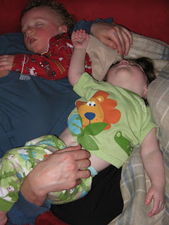 When Jay got home, he found us as you see in the pictures. The worst part was that I had a lovely glass of wine just to my left, but couldn't get to it because I had a baby in each hand. I need one of those hats that hold cans of beer.......