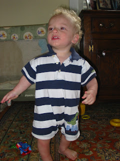 Saturday morning Jay started making some headway on his "honey do" list while the boys and I ran to the Farmer's Market and got corn and squash and zucchini and cucumbers. It was hotter than I realized and, by the time (well before 11) we got back, it was in the mid-80's and very humid. We had a little lunch (very little, in the case of Griffith) and then (blessedly) they both fell asleep for about 2 hours. Then they took a dip in the wading pool and got baths in anticipation of the arrival of Evan. Mom and Dad had to go to a wedding, Miranda had two weddings to sing in, and so Evan (her husband) came to hang out and do guy things -- watch ESPN and Spike TV and roughhouse. Griff had taken about 6 steps unassisted but Evan got him up to about 10. He's still pretty wary about it and would prefer to hold on, however lightly, to your hand, but some times forgets to be cautious and heads out.
